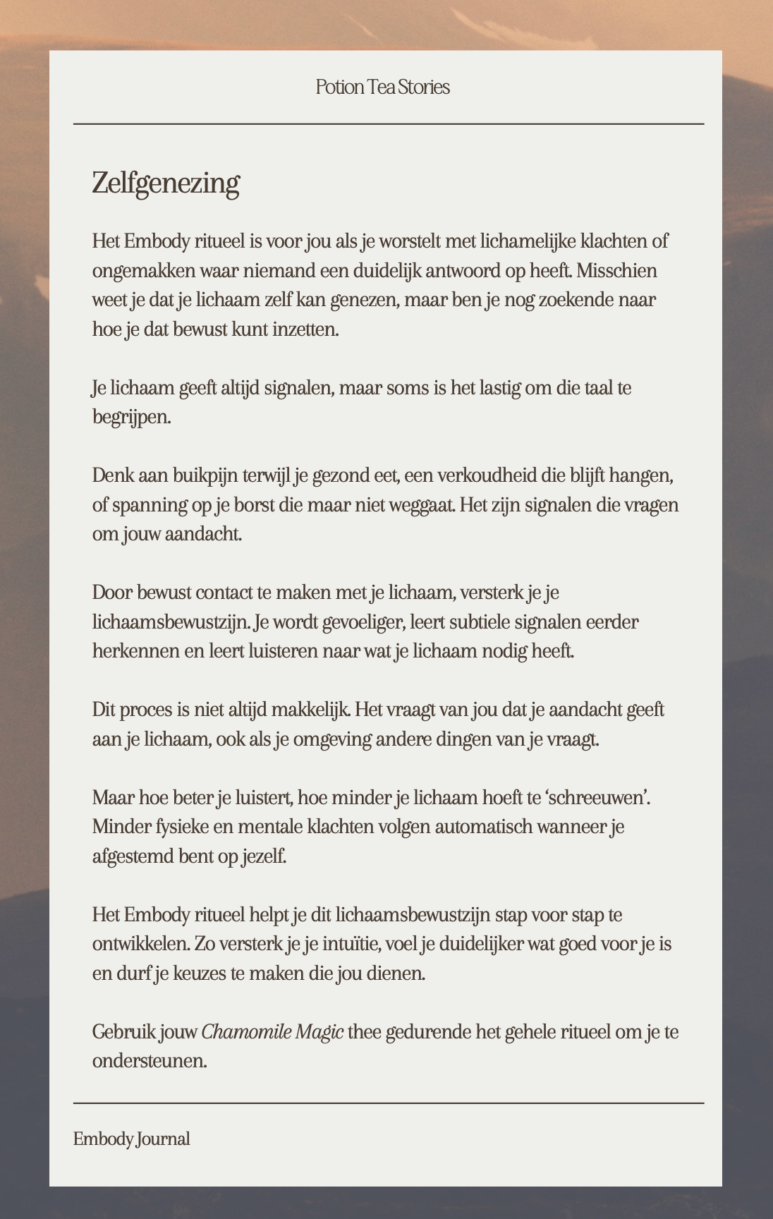 Embody bestaat uit een aantal onderdelen, je mag het in deze volgorde doen maar dat hoeft niet. Het is jouw persoonlijke at home tea ritual.